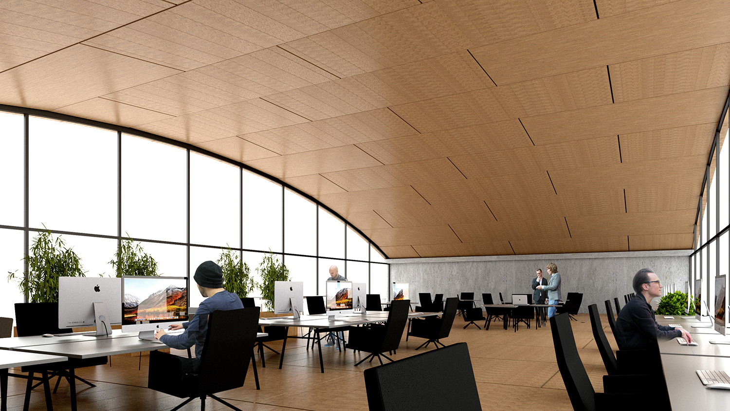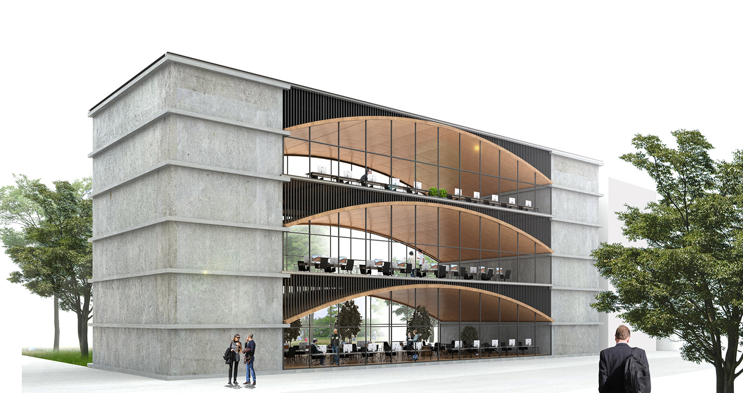 規格化され、品質が管理され、材料に指向性が少ない材料であるCLTの新しい活用の方法として、catalan vaultから着想を得た新しいCLTのヴォールト空間を提案。CLT-Vaultを用いることで柱のない開放的な一室空間ができ、中規模事務所ビルの新しいプロトタイプの計画案。