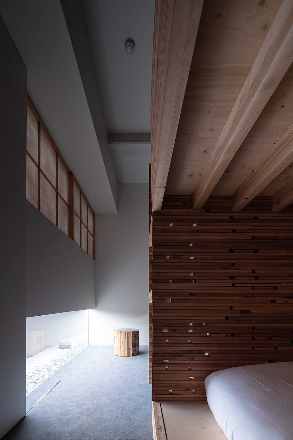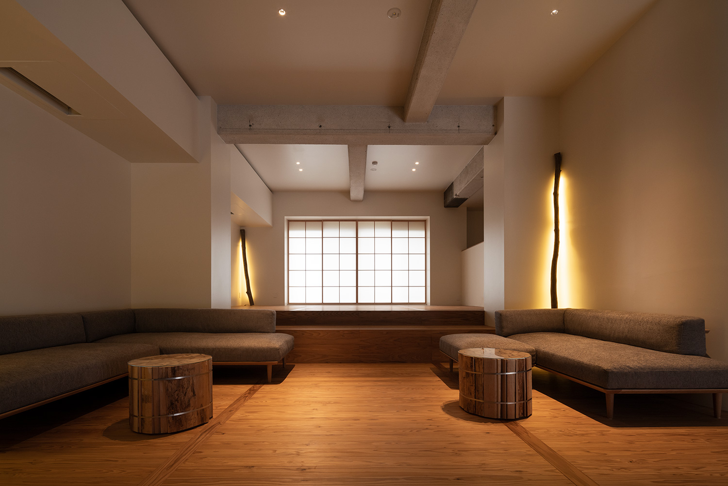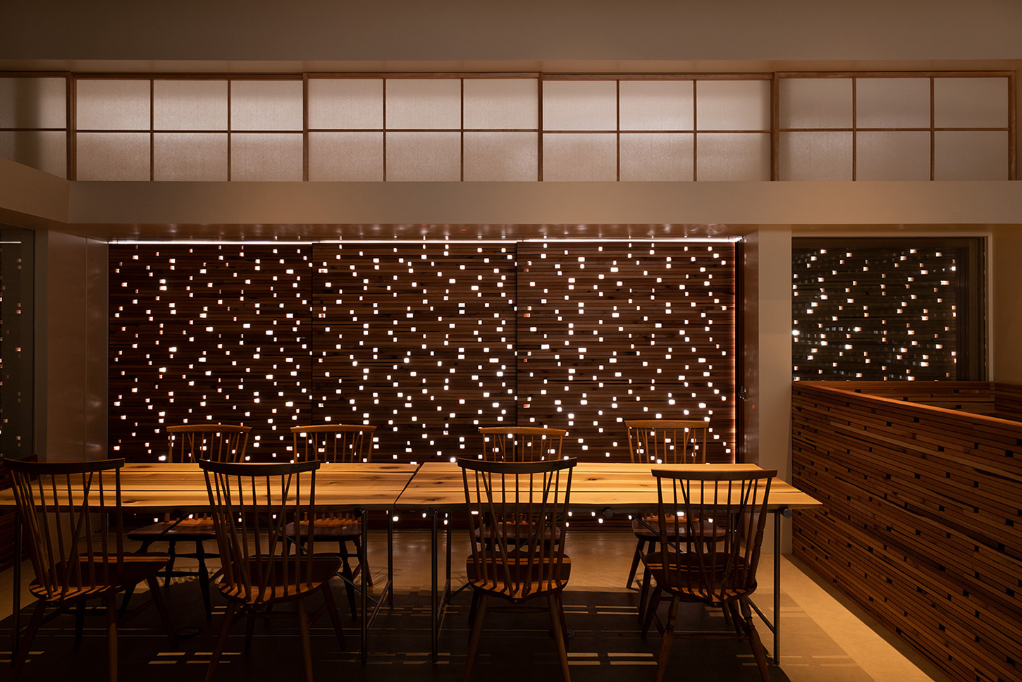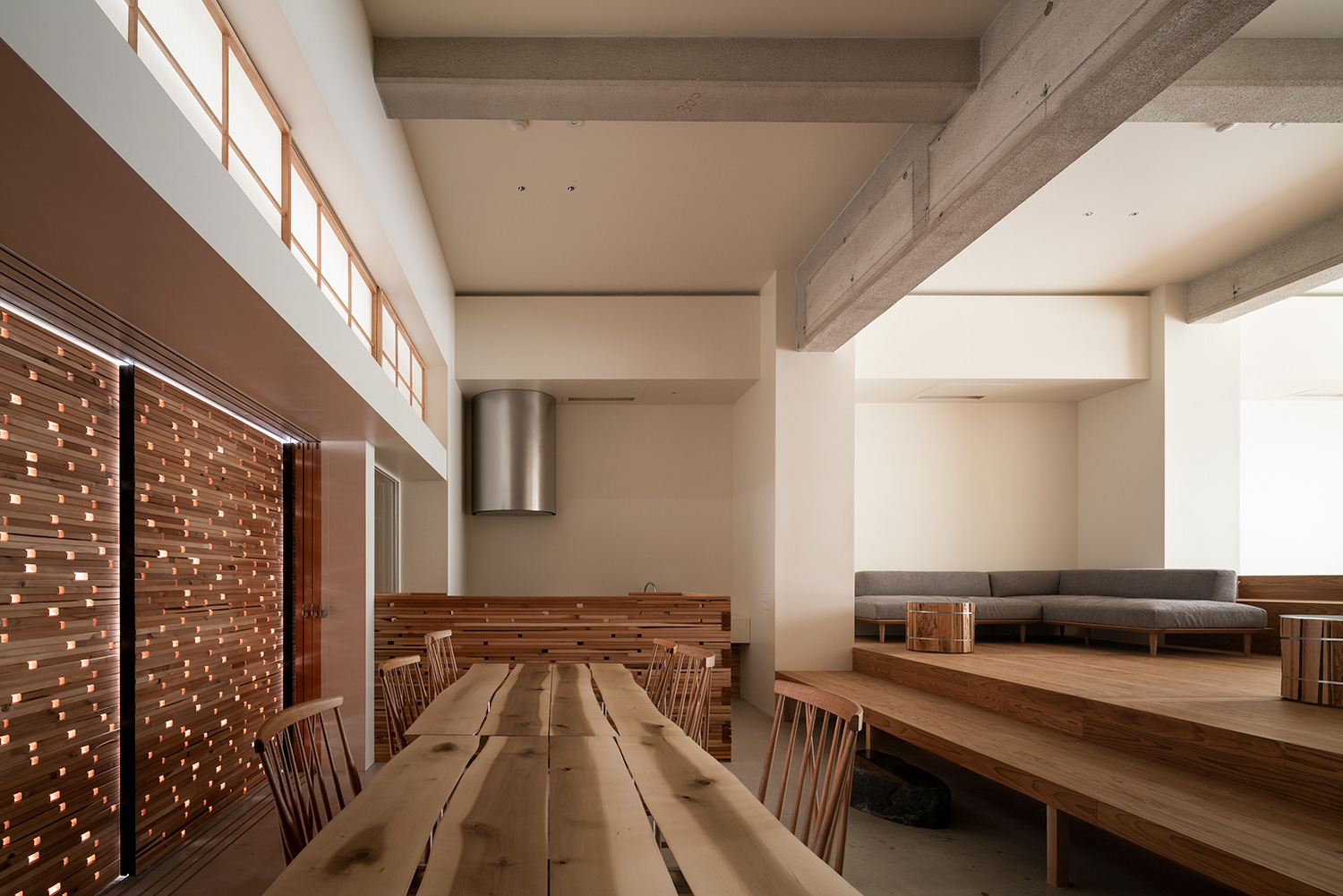 「あるものをいかす」をコンセプトに地域資源の活用可能性を様々な角度から提案した宿の改装計画している。本計画では急斜面の山から人力で2m単位に間伐された杉の小径木約200本分を建具・ベッドに再構築した。耐久性や色味にバラツキが多い材を柿渋塗装で整えつつ、時と共に成熟する空間を目指した。宿だけでなく「森と共に生きる」まちづくりの拠点として、年月を重ねながら成熟する新たな地域文化の「光景」となることを願う。